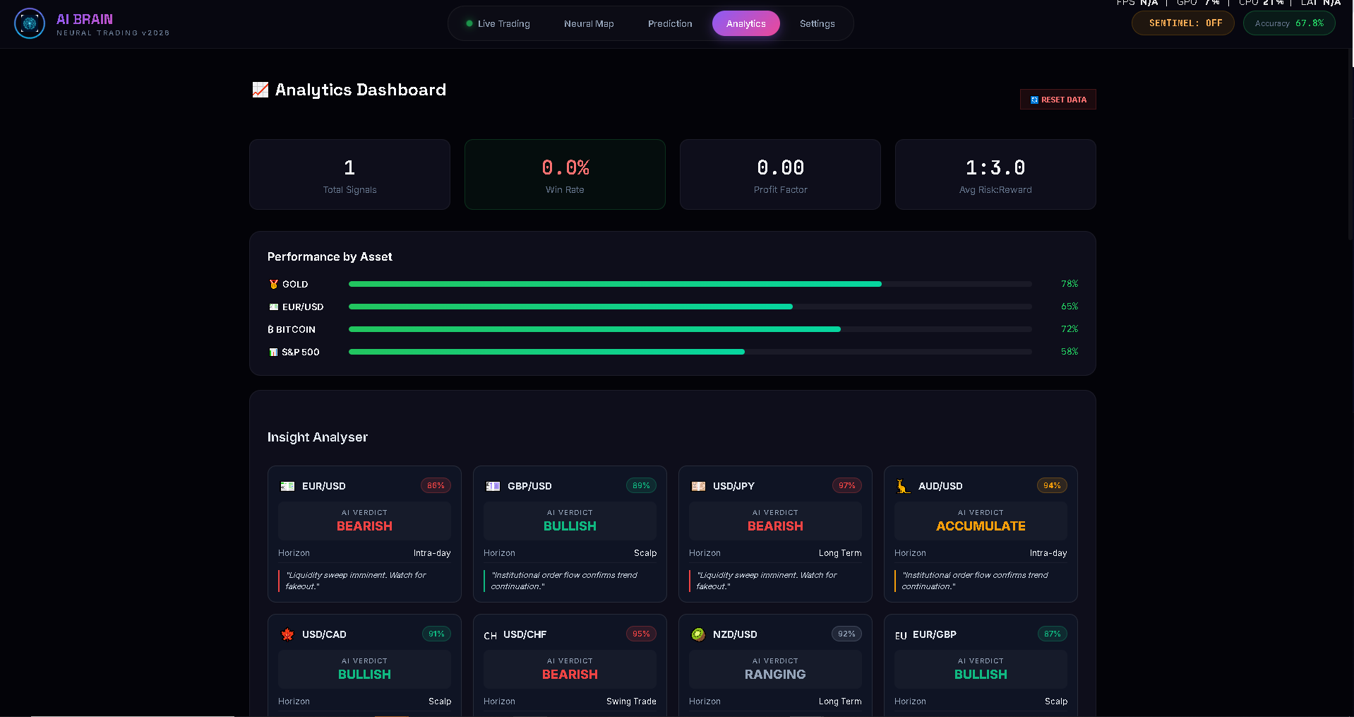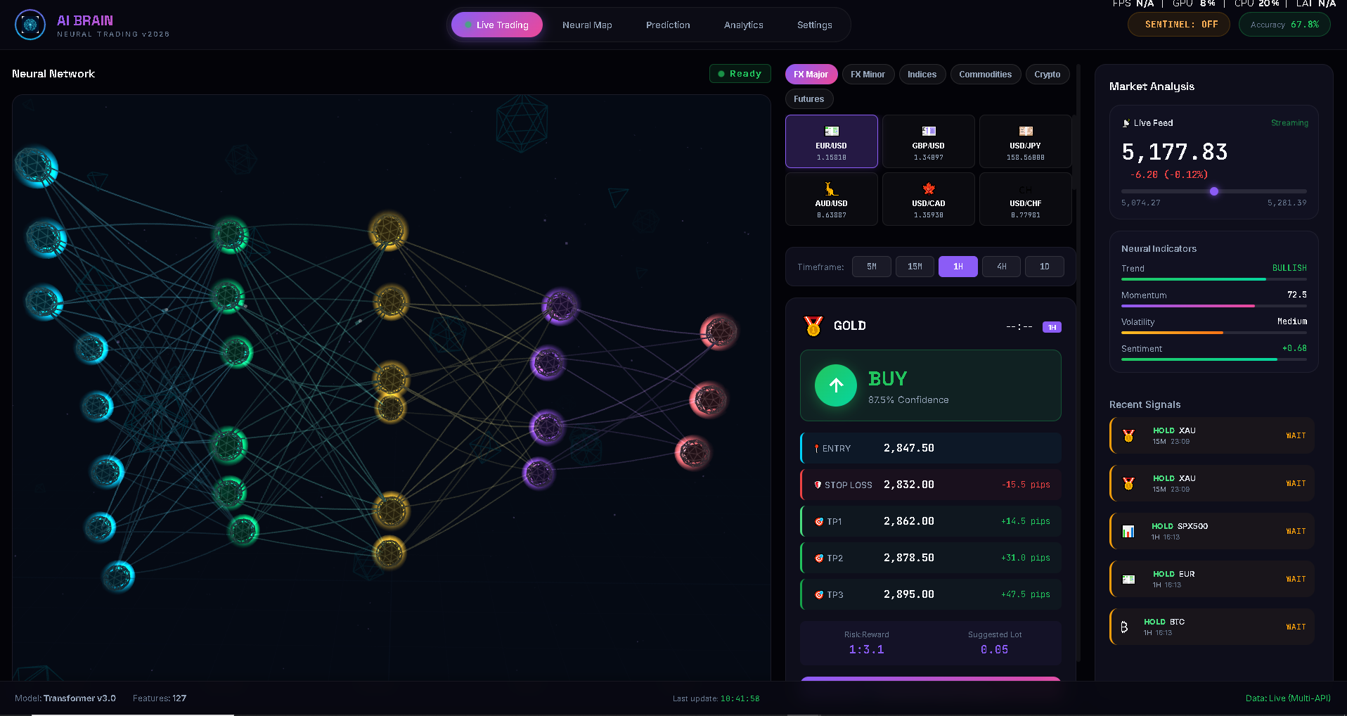 A full desktop neural trading intelligence system powered by a Transformer v3.0 model trained on 127 technical features across 35+ instruments. Includes pattern recognition, adaptive optimizer, push alerts, and Sentinel risk monitoring.
