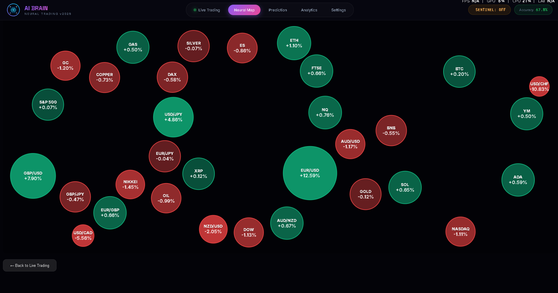 A full neural trading environment — live signals, market maps, analytics, and deep neural insight across 35+ instruments.