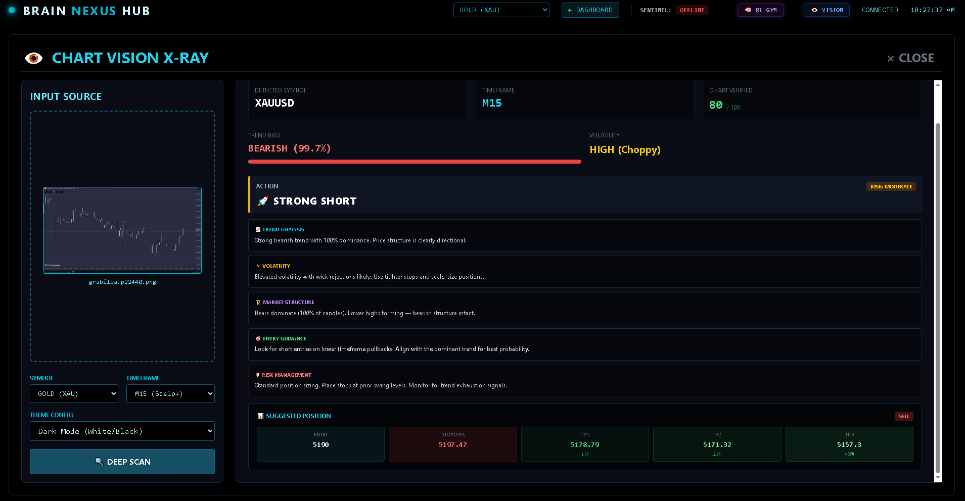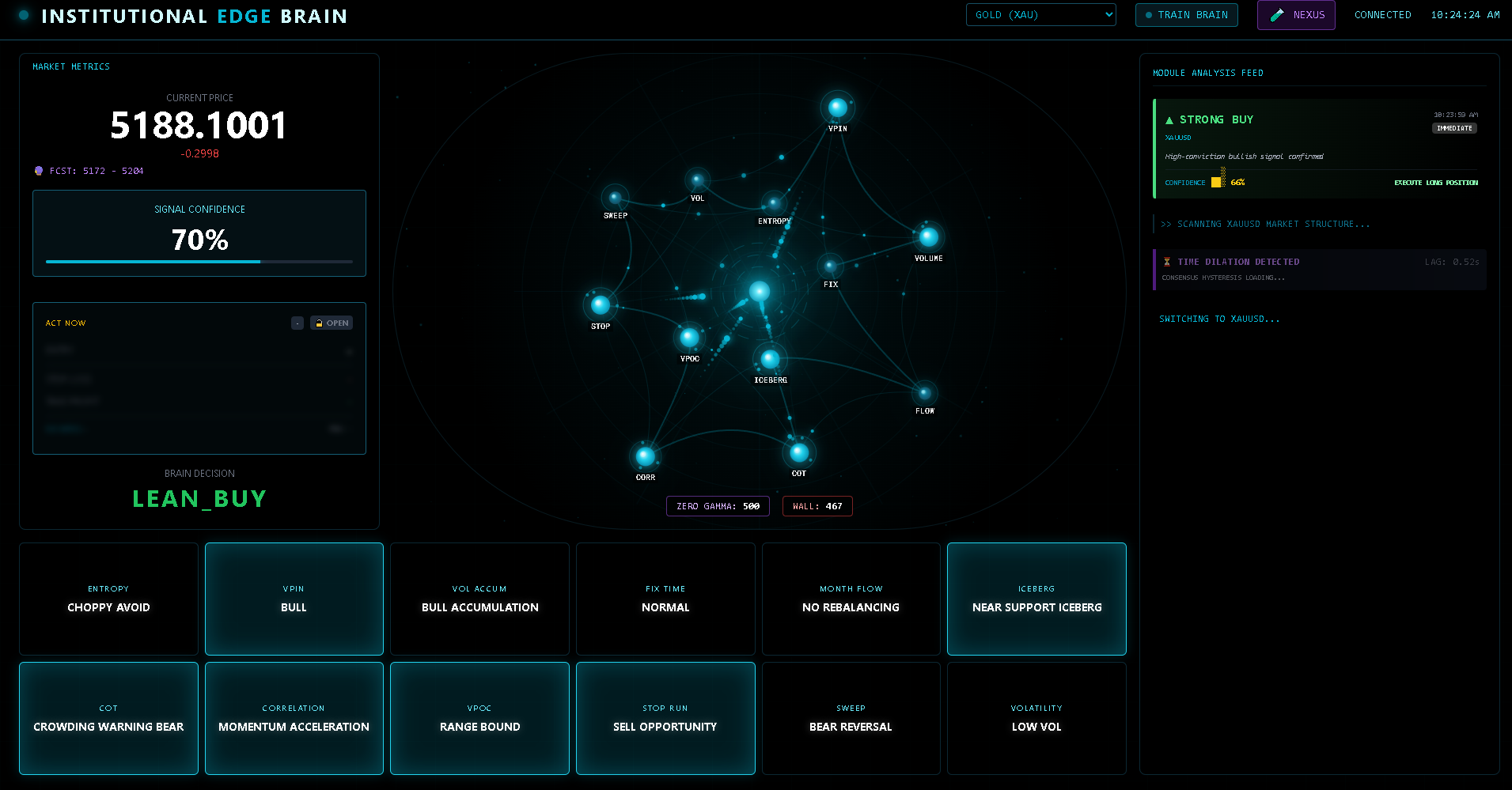 Switch instruments. Click neural nodes. Watch each of the 12 modules analyze the market in real-time.